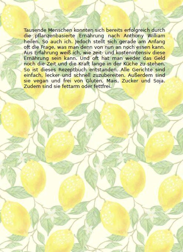 Tausende Menschen konnten sich bereits erfolgreich durch die pflanzenbasierte Ernährung nach Anthony William heilen. So auch ich. Jedoch stellt sich gerade am Anfang oft die Frage, was man denn von nun an noch essen kann. Aus Erfahrung weiß ich, wie zeit- und kostenintensiv diese Ernährung sein kann. Und oft hat man weder das Geld noch die Zeit und die Kraft lange in der Küche zu stehen. So ist dieses Rezeptbuch entstanden. Alle Gerichte sind einfach, lecker und schnell zuzubereiten. Außerdem sind sie vegan und frei von Gluten, Mais, Zucker und Soja. Zudem sind sie fettarm oder fettfrei.