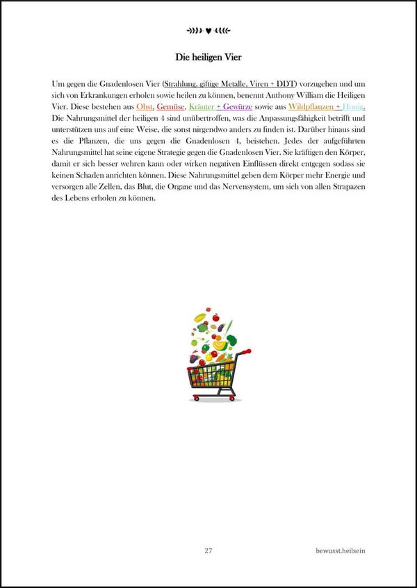 In diesem Handbuch sind alle wichtigen Basis-Informationen von Anthony William komprimiert zusammengefasst. Es dient zur Start- und Ortientierungshilfe und ist gerade für diejenigen empfehlenswert, die mit den ganzen Informationen überfordert sind, nicht wissen wo und wie sie anfangen können und/oder einfach noch nicht die Kraft oder Zeit haben, sich damit auseinanderzusetzen.