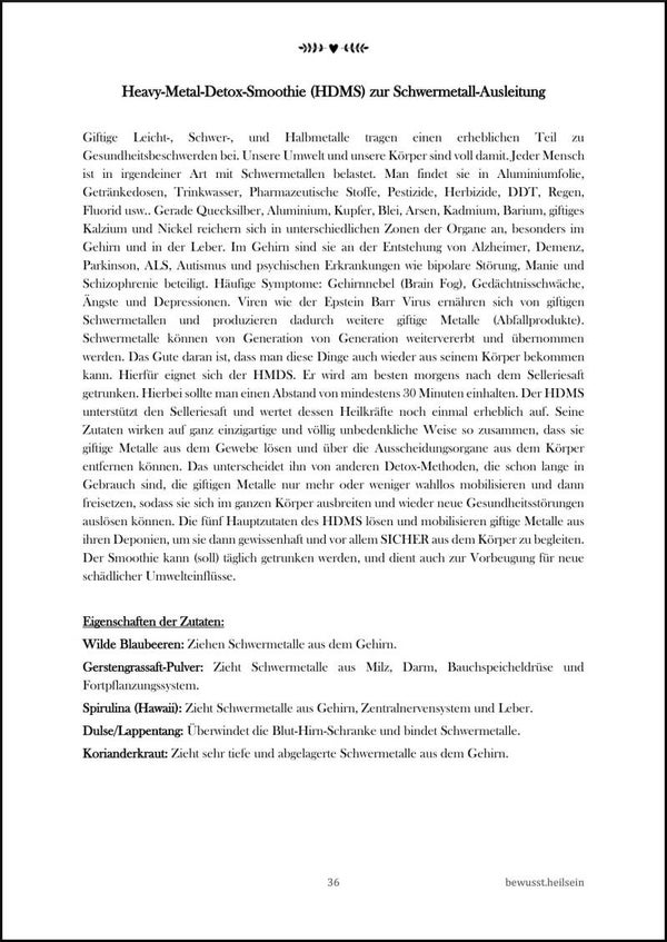 - Weiteres: Praktische Listen zu den heilsamen Lebensmitteln (Die heiligen Vier), No Foods, Trigger-Faktoren sowie Informationen und Anleitung zum Selleriesaft + Heavy Metall Detox Smoothie uvm.